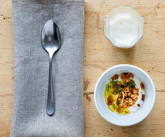 Denna rätt är rätt salt, vilket passar till mjölken. Mjölken är toppad med lättvispad grädde.