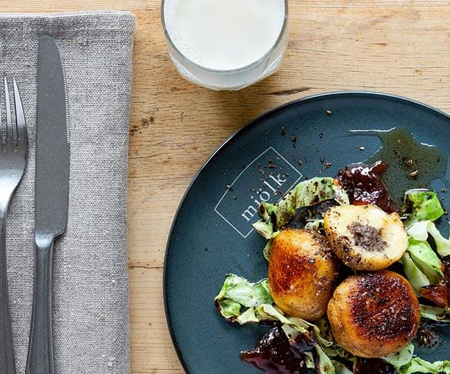 Sött, salt och hett. Stekyta, mjöl, ägg och liter mera sött – det klarar mjölken! Kroppkakor fyllda med svamp tillsammans med stekt spetskål och plommonsylt på plommon.